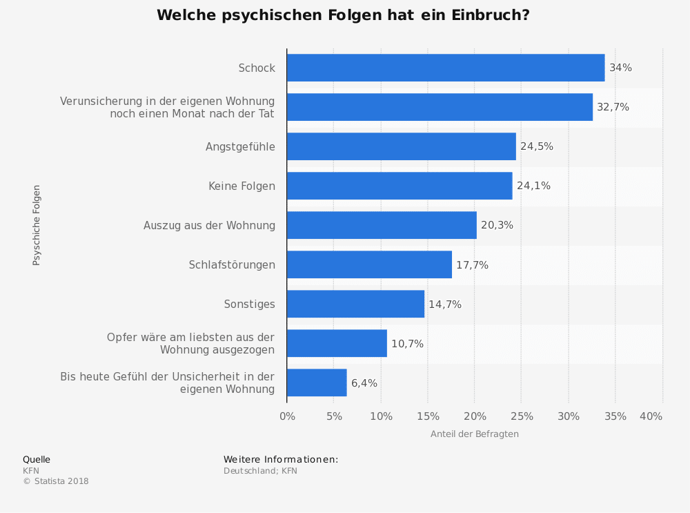 Die Folgen eines Einbruchs sind für die Betroffenen ähnlich und führen zu einem grundsätzlichen Verlust des Vertrauens. Gerd Reimann von der Deutschen Psychologen Akademie in Berlin beobachtet Symptome wie Angstzustände, Unruhe, Schlaflosigkeit, Albträume und sogar körperliche Beschwerden wie Kopfschmerzen, Herz-Kreislauf- oder Magen-Darm-Probleme.